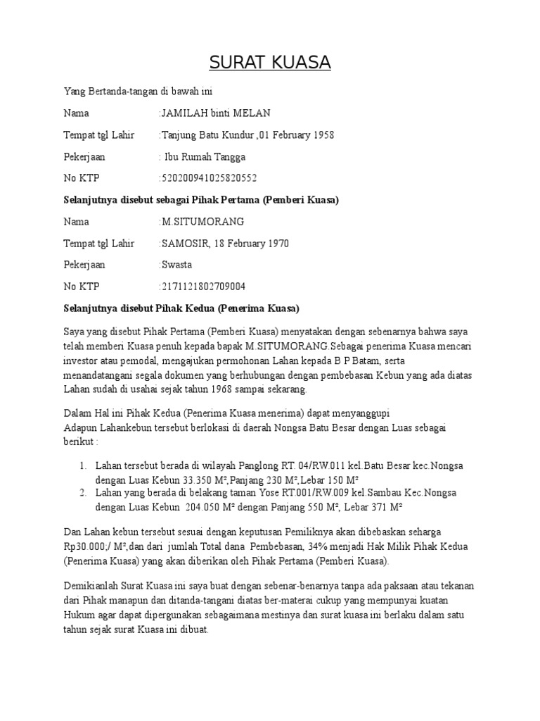 Di artikel ini kita hendak mencoba membahas tentang. #1 contoh surat kuasa penjualan tanah dan rumah pribadi. Begitu juga ketika seorang pimpinan perusahaan harus memberikan kewenangan sementara kepada staf yang dipercaya untuk mewakilinya. 12 contoh surat kuasa pengambilan sertifikat tanah. Dua bidang tanah perladangan yang terletak di desa wonorejo kec. Ini dia beberapa contoh suratnya. Surat kuasa individu atau juga pribadi adalah surat keterangan yang membuat orang memiliki hak sesuai yang disebutkan pada surat itu. Bagaimana cara membuat surat kuasa? Untuk dan atas pemberi kuasa, maka penerima kuasa diberi kuasa untuk menjual tanah seluas. Kekuasaan pengacara diperlukan ketika seseorang tidak dapat langsung melakukan pekerjaan t. Surat kuasa dibuat oleh seseorang yang memiliki kesibukan atau halangan tertentu dan diberikan kepada orang lain yang terpercaya dikarenakan yang bersangkutan tidak dapat melakukan suatu hal. Pada umumnya surat kuasa berhubungan dengan pengambilan suatu suatu barang, contohnya pengambilan bpkb, gaji, uang, dan sebagainya. Ptsl merupakan kependekan dari pendaftaran tanah sistematis lengkap.